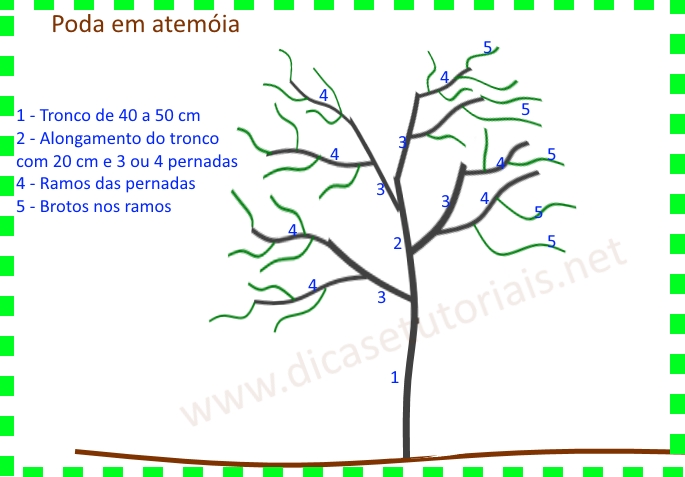 A poda da atemoia, que é uma fruta híbrida que é obtida através do cruzamento da cherimoia (Annona cherimola, Mill) com a fruta-pinha (Annona squamosa, L.) deve começar a ser feita quando a planta ainda é jovem, obedecendo a sequência abaixo descrita: